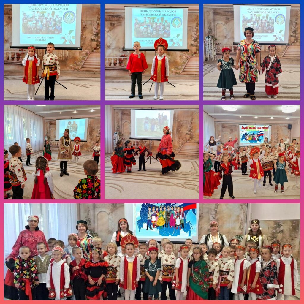 Воспитанники подготовительных групп детского сада «Огонек» познакомились с историей возникновения праздника и узнали, что на Тамбовщине проживают более ста национальностей. У каждого народа имеются свои народные костюмы, обычаи, традиции, которые они чтят, хранят и передают из поколения в поколения. Дети рассматривали костюмы, читали стихи, пели песни о дружбе людей разных национальностей, играли в народные игры.