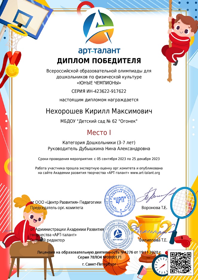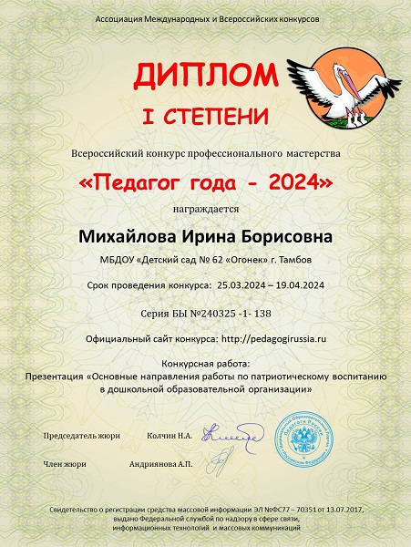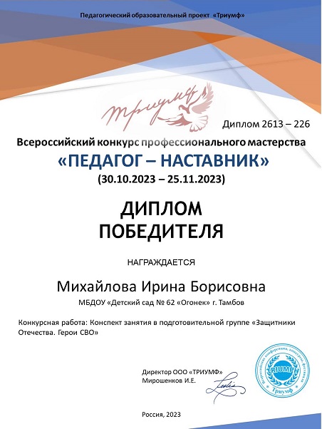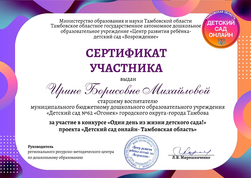 Курсы повышения квалификации «Современные подходы к реализации ФГОС дошкольного образования» 2021 г., «Современные образовательные технологии в реализации дополнительного образования и воспитания обучающихся» 2023 г., «Оказание первой помощи пострадавшим» 2023 г., «Управление дошкольной образовательной организацией в условиях реализации ФОП дошкольного образования» 2024 г., «Возможности ИКОП «Сферум» и VK Мессенджера для решения образовательных задач» 2024 г., «Профессиональное совершенствование педагога ДОО в рамках конкурса «Воспитатель года – 2025»